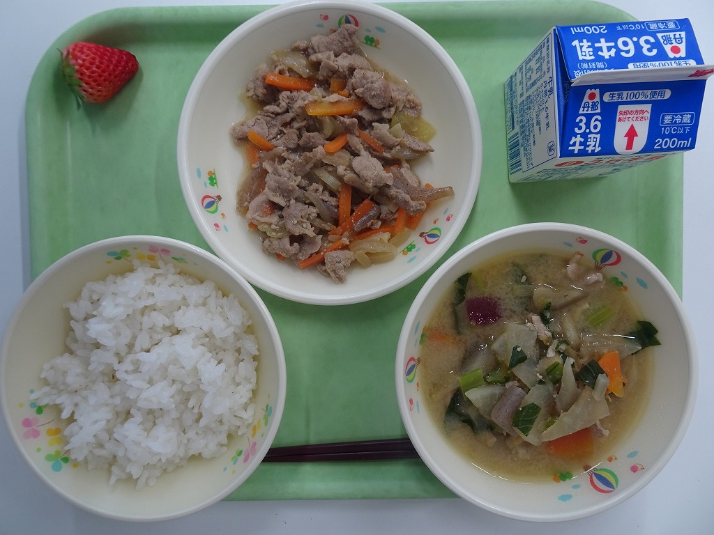 2/6(金)麦入りごはん ぶた肉のしょうがに さつま汁 いちご