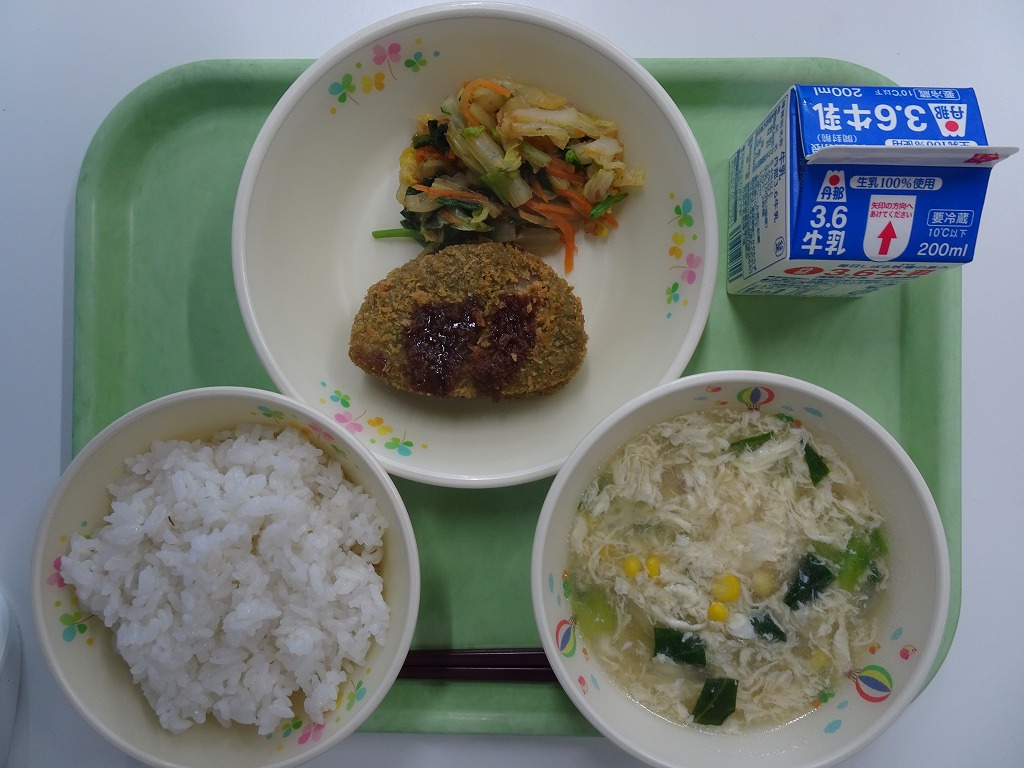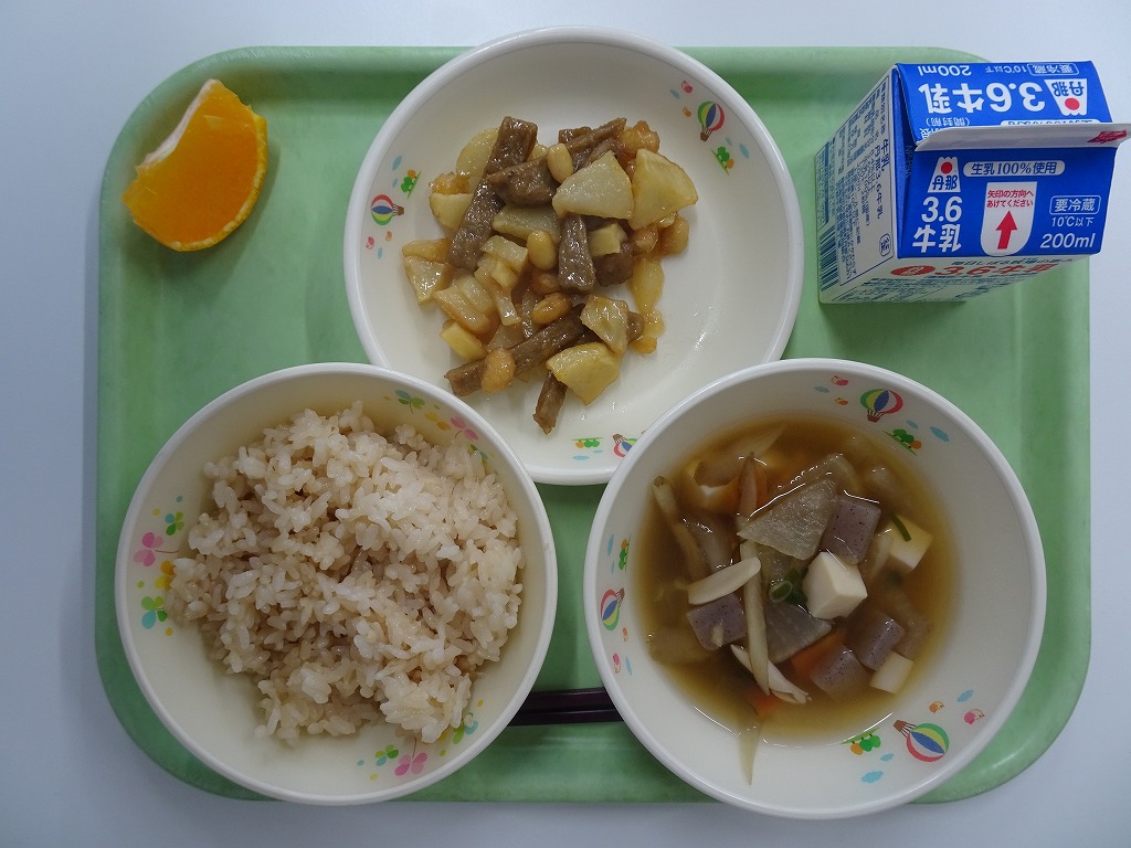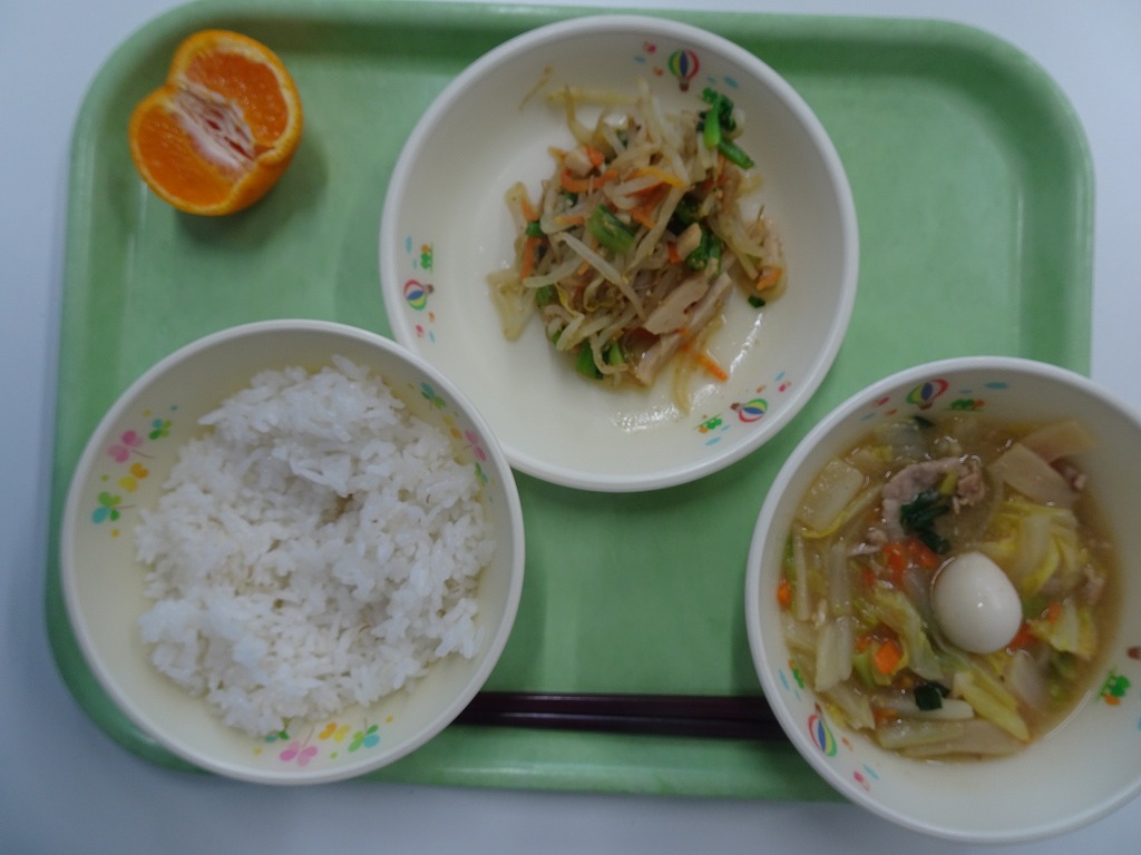 1/13(火)麦入りごはん やきにく チンゲンサイとたまごのスープ みかん