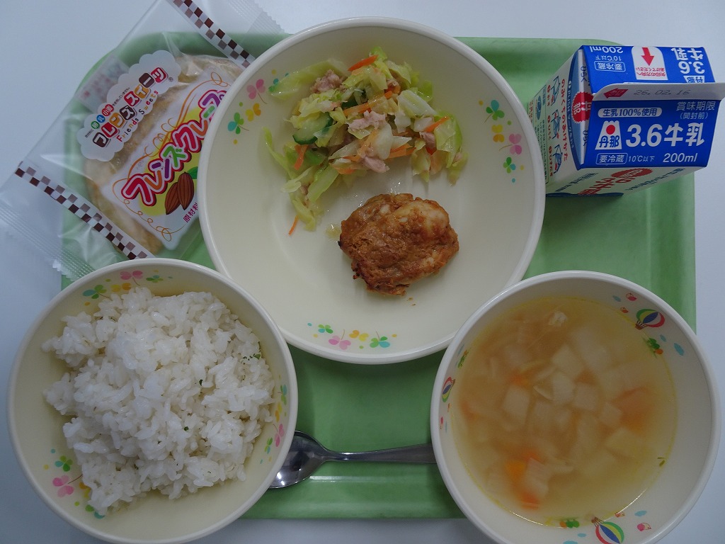 2/20(金)※ふじっぴー給食 麦入りごはん 黒はんぺんお茶フライ おかかあえ チンゲンサイとたまごのスープ