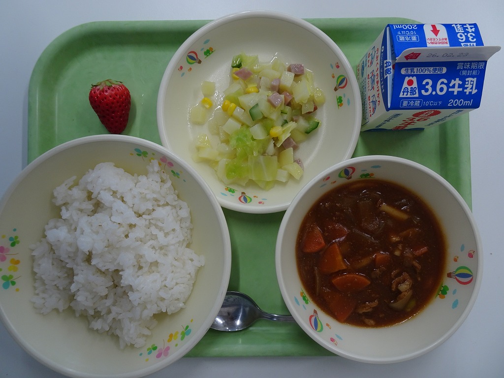 2/16(月)麦入りごはん ハヤシライス マセドアンサラダ いちご
