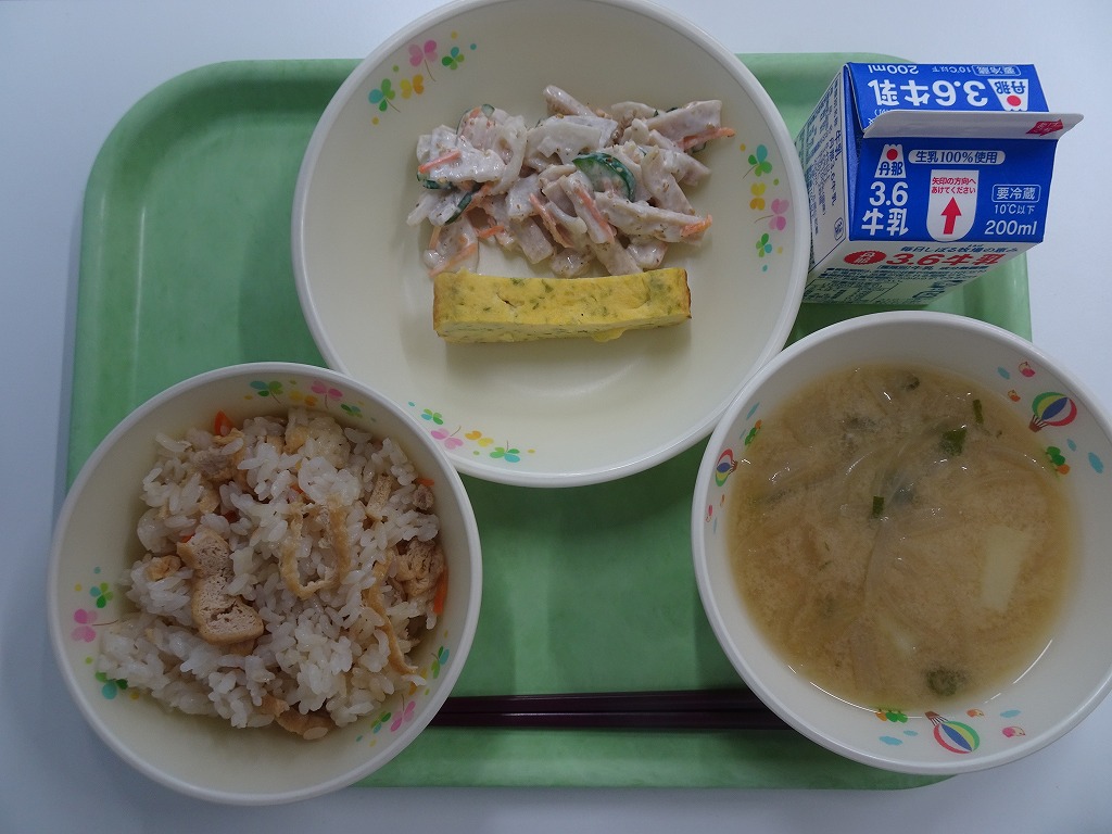 2/19(木)きつねごはん シラスと青さのたまごやき れんこんサラダ みそ汁