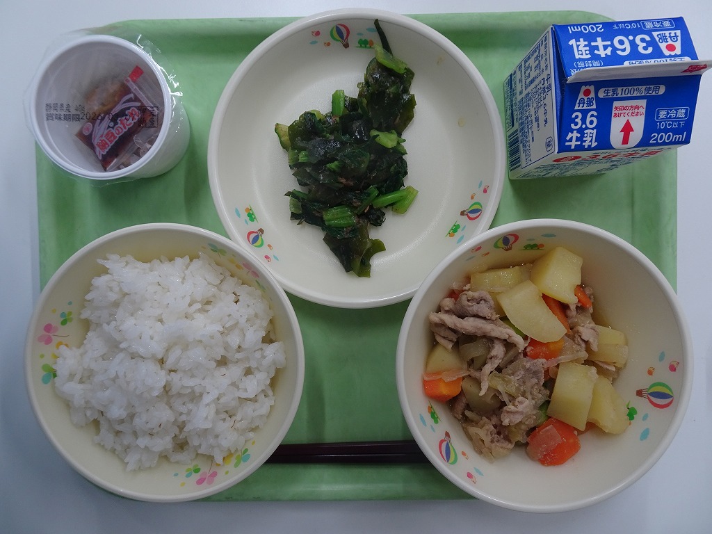 2/25(水)麦入りごはん なっとう 肉じゃが ワカメのおひたし