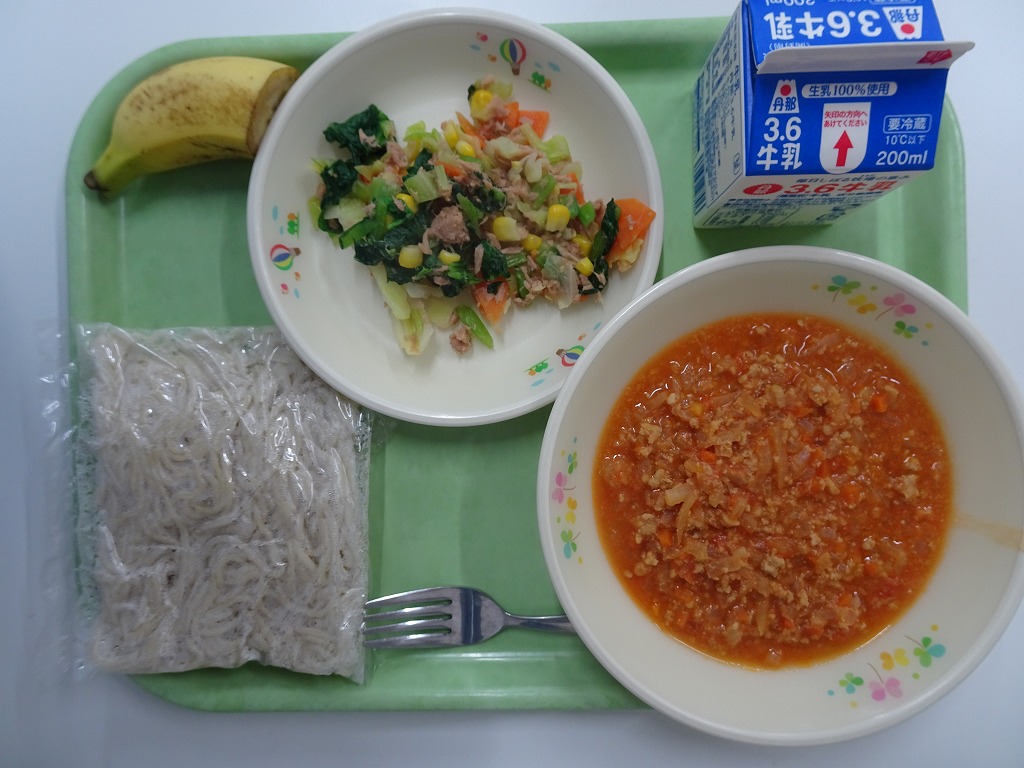 3/3(火)ソフトめん 函南トマトのミートソース こまツナサラダ バナナ