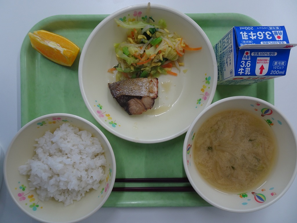 3/9(月)麦入りごはん ブリのてりやき ちぐさあえ みそ汁 オレンジ