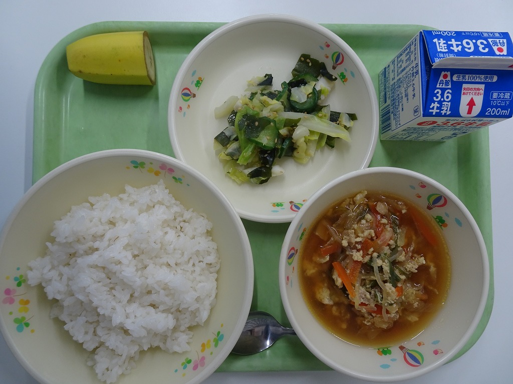 9/24(水)麦入りごはん ぶた肉とキャベツのみそいため かきたまスープ バナナ