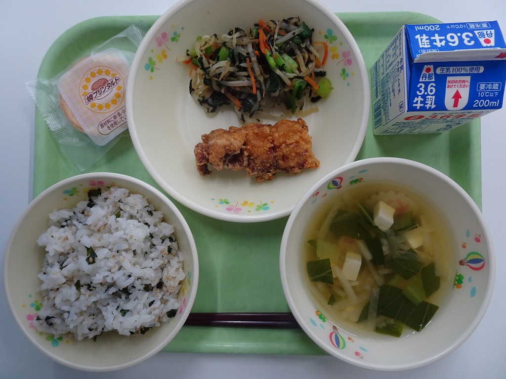 3/17(火)※給食最終日 ワカメごはん とり肉のからあげ いそびたし すまし汁 やきプリンタルト